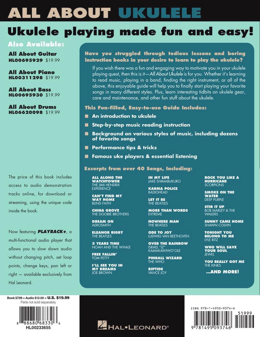Have you struggled through tedious lessons and boring instruction books in your desire to learn to play the ukulele? If you wish there was a fun and engaging way to motivate you in your uke playing quest, then this is it: All About Ukulele is for you. Whether it’s learning to read music, playing in a band, finding the right instrument, or all of the above, this enjoyable guide will help you to finally start playing your favorite songs in many different styles. Plus, learn interesting tid-bits on ukulele gear, care and maintenance, other fretted instruments, and other fun stuff about the uke. This fun-filled, easy-to-use guide includes: