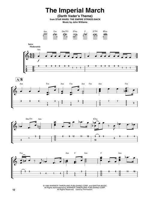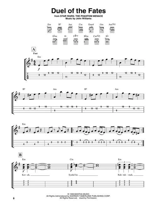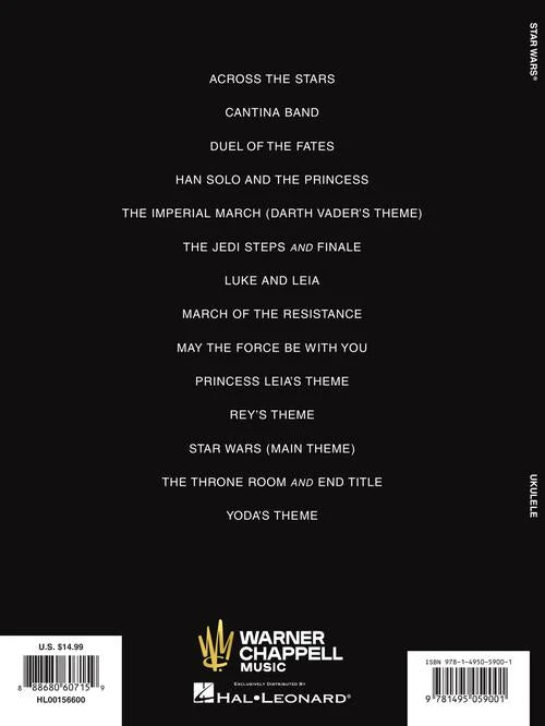 Now you can play John Williams’ masterpieces from the Star Wars franchise on the ukulele in this songbook featuring notes and tab. Songs: Across the Stars • Cantina Band • Duel of the Fates • Han Solo and the Princess • The Imperial March (Darth Vader’s Theme) • The Jedi Steps and Finale • Luke and Leia • March of the Resistance • May the Force Be with You • Princess Leia’s Theme • Rey’s Theme • Star Wars (Main Theme) • The Throne Room (And End Title) • Yoda’s Theme.