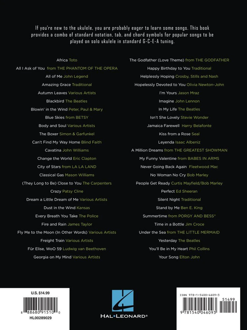 If you’re new to ukulele, you’re probably eager to learn to play some songs. This one-of-a-kind collection provides a combo of standard notation, tab, and chord symbols for popular songs to be played on solo ukulele in standard G-C-E-A tuning for fingerstyle, chord melody performance. Songs include: Africa • Blackbird • Blowin’ in the Wind • Body and Soul • City of Stars • Crazy • Fire and Rain • Georgia on My Mind • I’m Yours • Imagine • A Million Dreams • People Get Ready • Stand by Me • Yesterday • Your Song • and more.