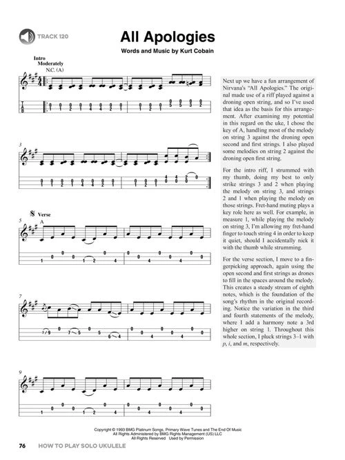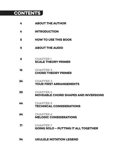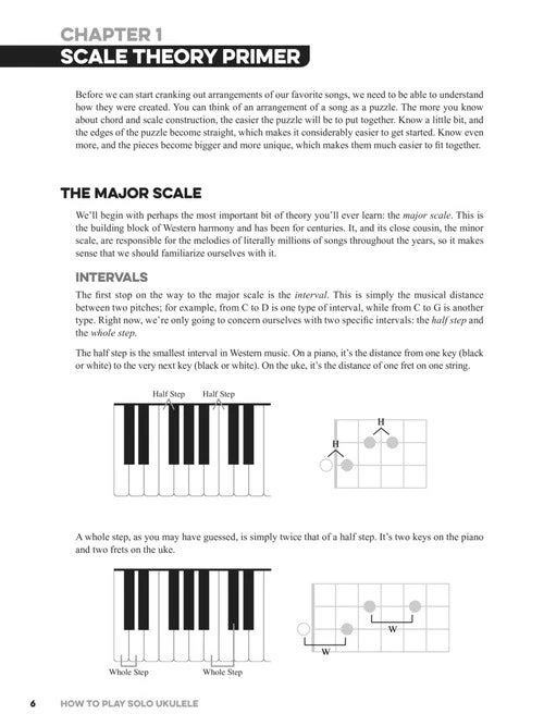 Designed for the intermediate ukulele player, this book will guide you to a new level of musicianship on the instrument. By learning to arrange songs for solo performance on the uke, you’ll gain invaluable musical knowledge in scale and chord theory, harmonization, song form, myriad picking techniques such as fingerstyle and chord-melody, and much more. Inside you’ll find popular songs arranged for solo ukulele in a variety of styles to study and practice, along with a complete process of “How to” do it yourself! Also included are audio demonstration tracks for almost every example in the book, plus standard notation, tablature and helpful chord diagrams.