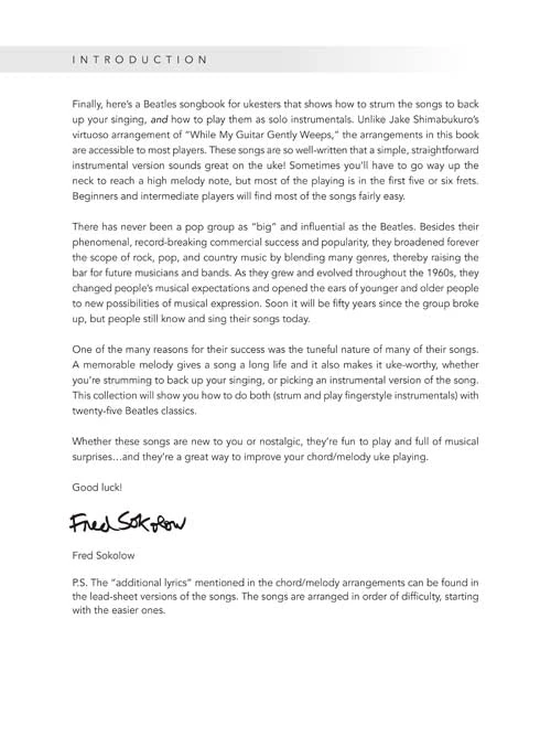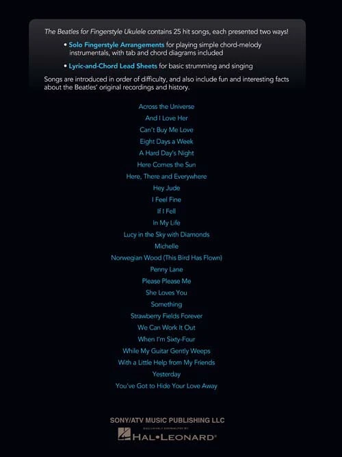 The Beatles for Fingerstyle Ukulele contains 25 favorite songs, each presented two ways: first as solo fingerstyle arrangements for playing simple chord-melody instrumentals with tab and chord diagrams included and also as lyric-and-chord lead sheets for basic strumming and singing. Songs are introduced in order of difficulty and also include fun and interesting facts about the Beatles’ original recordings and history. Songs include: Across the Universe • And I Love Her • Can’t Buy Me Love • Eight Days a Week • Here Comes the Sun • Hey Jude • In My Life • Lucy in the Sky with Diamonds • Something • While My Guitar Gently Weeps • Yesterday • You’ve Got to Hide Your Love Away • and more.