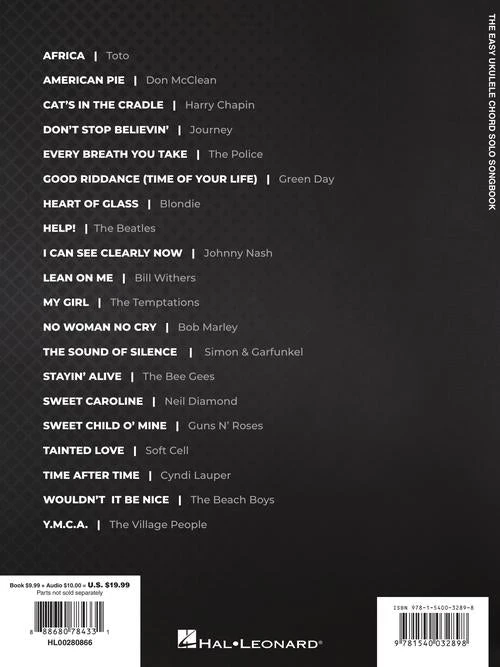Beginning ukulele players can start playing their favorite pop songs with this collection featuring standard notation and tab. 20 songs, including: Africa • Don’t Stop Believin’ • Every Breath You Take • Help! • I Can See Clearly Now • My Girl • The Sound of Silence • Sweet Caroline • Wouldn’t It Be Nice • Y.M.C.A. • and more.