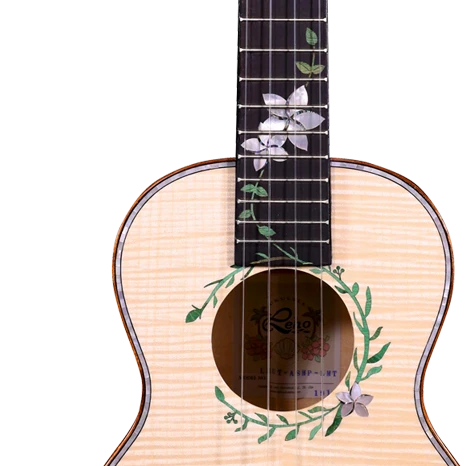 Beautiful laurel and floral inlays complete all this art, with ebony fingerboard and bridge. Available in Concert and Tenor bodies with Worth premium strings-set and LEHO’s best #230 23mm padded Gig Bag with stitched, multicolor logo.